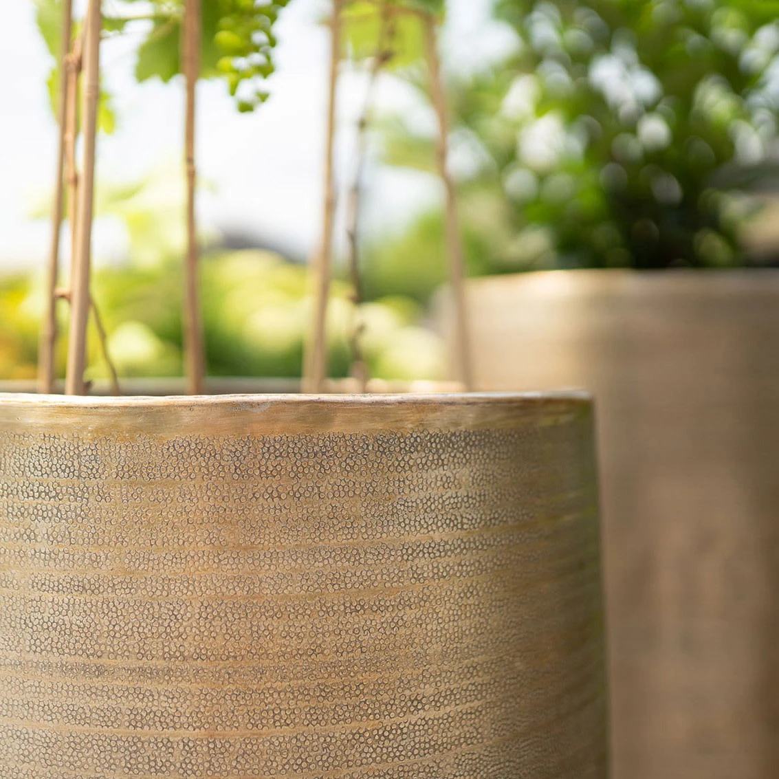 Dieses schlanke Pflanzgefäß von unserer Eigenmarke bereichert Ihr Begrünungskonzept mit einem luxuriösen Akzent und macht in jedem Einrichtungskontext eine ausgezeichnete Figur. Der Pflanztopf ‚Rowen‘ aus Leichtmetall Aluminium präsentiert sich in schicker Goldoptik und punktet nicht zuletzt mit einer per Hand aufgetragenen einzigartigen Oberflächenstruktur. Aus diesem Grund stellt jedes Pflanzgefäß ein unverwechselbares Unikat dar und eignet sich ideal für Ihre anspruchsvolle Garten- oder Balkongestaltung. Da der Übertopf aus einem rostfreien und witterungsbeständigen Material besteht, können Sie das schicke Accessoire gerne über das ganze Jahr im Außenbereich stehen lassen. Der imposante Pflanztopf ‚Rowen‘ fasst rund 90 Liter und lässt sich dank seiner schlanken Form dekorativ mit überhängend wachsenden Pflanzen bestücken. Wenn Sie den Blumentopf dagegen mit Ziergräsern oder Bambus bepflanzen, entsteht ein unerwartet dynamisches Gesamtbild.